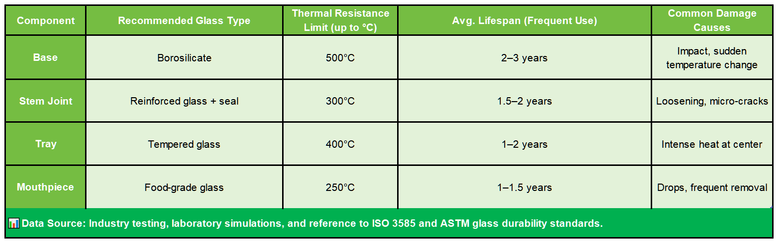 The table below provides a clear comparison of the durability of glass hookah components, highlighting their recommended glass types, thermal resistance, average lifespan, and typical weak points. This data helps both consumers and brands make smarter decisions when choosing glass hookah accessories for long-term use.