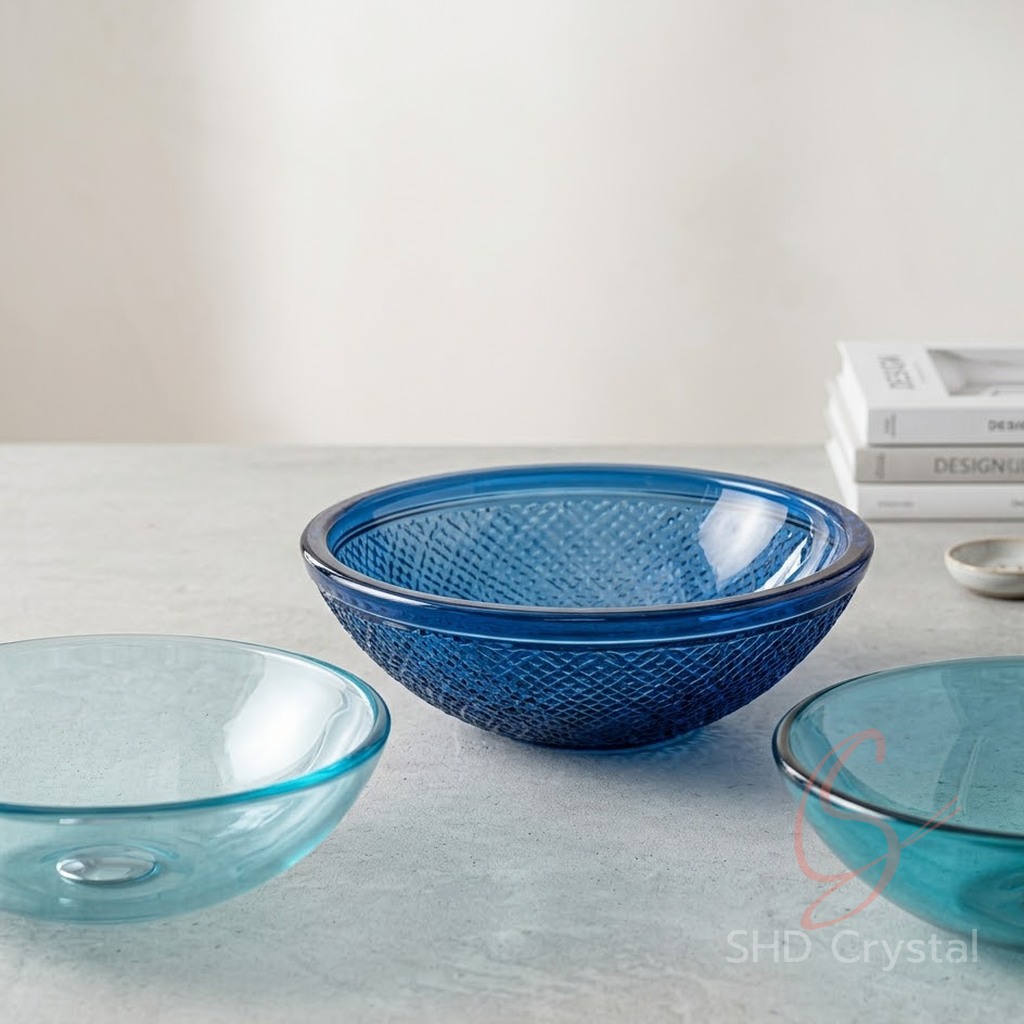 A premium blue glass washbasins displayed on a neutral surface, professional product photography style. Soft studio lighting highlighting the glass clarity and craftsmanship details. Clean background suitable for blog content.